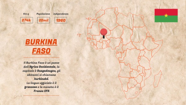 Il Burkina Faso è un paese dell'Africa Occidentale, la capitale è Ouagadougou, gli abitanti si chiamano burkinabé.La lingua ufficiale è il francese e la moneta è il Franco CFA
