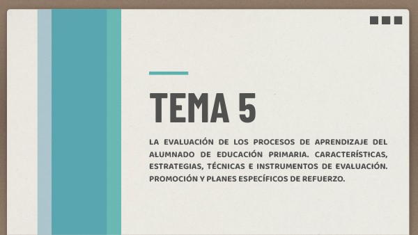 A través de los contenidos desarrollados en el tema se ha pretendido no solo enriquecer la práctica reflexiva en relación con la evaluación de los procesos de aprendizaje, sino considerar y reconocer el desarrollo de las distintas capacidades a evaluar y las técnicas e instrumentos más adecuados para concretar la evaluación. La evaluación no es un fin de la educación, es un medio que permite obtener información para orientar el proceso educativo. No se puede considerar de forma separada del proceso de enseñanza y aprendizaje, ya que forma parte de él y actúa como elemento regulador del mismo. Es un proceso de recogida, análisis y valoración de la información sobre el aprendizaje de cada alumno o alumna con la finalidad de detectar posibles dificultades y adoptar las medidas necesarias para que las superen. Desde esta perspectiva, la evaluación tiene un carácter formativo, de mejora del alumnado y del propio proceso.