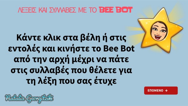 Κάνε κλικ στις εντολές και οδήγησε το bee bot στις συλλαβές για να φτιάξεις τη λέξη που θέλεις. Μη ξεχάσεις την εντολή pause || σε κάθε συλλαβή