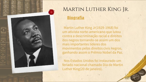 Martin Luther King Jr(1929-1968) foi um ativista norte-americano que lutou contra a descriminação racial e direitos dos negros tornando-se assim um dos mais importantes líderes dos movimentos pelos direitos civis negros, ganhando assim o Prêmio Nobel da Paz. Nos Estados Unidos foi instaurado um feriado nacional chamado Dia de Martin Luther King(20 de janeiro).