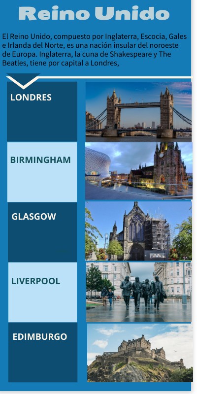El Reino Unido, compuesto por Inglaterra, Escocia, Gales e Irlanda del Norte, es una nación insular del noroeste de Europa. Inglaterra, la cuna de Shakespeare y The Beatles, tiene por capital a Londres,