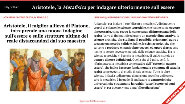Aristotele, il miglior allievo di Platone, intraprende una nuova indagine sull'essere e sulle strutture ultime del reale distaccandosi dal suo maestro.