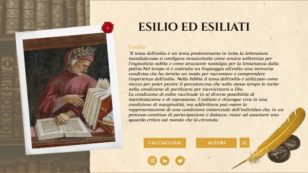 "Il tema dell’esilio è un tema predominante in tutta la letteratura mondiale,esso si configura innanzitutto come amara sofferenza per l'ingiustizia subita e come straziante nostalgia per la lontananza dalla patria.Nel tempo si è costruito un linguaggio all’esilio una memoria condivisa che ha fornito un modo per raccontare e comprendere l’esperienza dell’esilio. Nella bibbia il tema dell’esilio è utilizzato come mezzo per poter punire il peccatore,ma che nello stesso tempo lo mette nella condizione di purificarsi per riavvicinarsi a Dio. La condizione di esilio racchiude in sé diverse possibilità di manifestazione e di espressione. L’esiliato è chiunque viva in una condizione di marginalità, ma addirittura può essere la rappresentazione di una condizione esistenziale dell'individuo che, in un processo continuo di partecipazione e distacco, riesce ad assumere uno sguardo critico sul mondo che lo circonda.