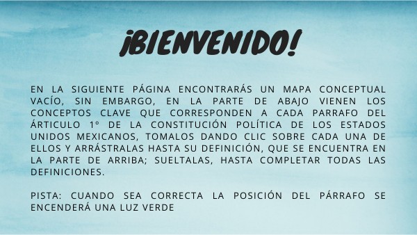EN LA SIGUIENTE PÁGINA ENCONTRARÁS UN MAPA CONCEPTUAL VACÍO, SIN EMBARGO, EN LA PARTE DE ABAJO VIENEN LOS CONCEPTOS CLAVE QUE CORRESPONDEN A CADA PARRAFO DEL ÁRTICULO 1º DE LA CONSTITUCIÓN POLÍTICA DE LOS ESTADOS UNIDOS MEXICANOS, tomalOs dando clic sobre cada una de ellOs y arrástralas hasta su definición, que se encuentra EN LA PARTE DE ARRIBA; sueltalas, hasta completar TODAS LAS definiciones. pista: cuando sea correcta la posición del párrafo se encenderá una luz verde
