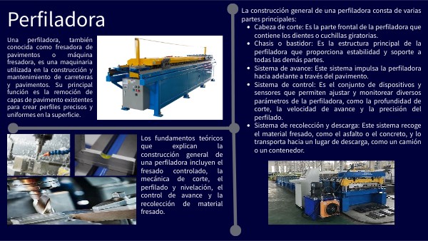Los fundamentos teóricos que explican la construcción general de una perfiladora incluyen el fresado controlado, la mecánica de corte, el perfilado y nivelación, el control de avance y la recolección de material fresado.