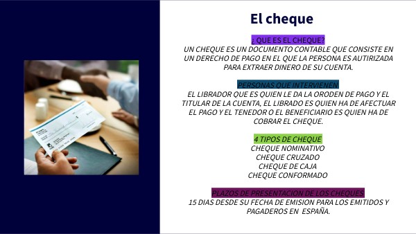 ¿ Que es el cheque? un cheque es un documento contable que consiste en un derecho de pago en el que la persona es autirizada para extraer dinero de su cuenta. personas que intervienen eL LIBRADOR QUE ES QUIEN LE DA LA ORODEN DE PAGO Y EL TITULAR DE LA CUENTA, EL LIBRADO ES QUIEN HA DE AFECTUAR EL PAGO Y EL TENEDOR O EL BENEFICIARIO ES QUIEN HA DE COBRAR EL CHEQUE. 4 tipos de cheque cheque nominativo cheque cruzado cheque de caja cheque conformado plazos de PRESENTACION DE LOS CHEQUES 15 dias desde su fecha de emision para los emitidos y pagaderos en España.
