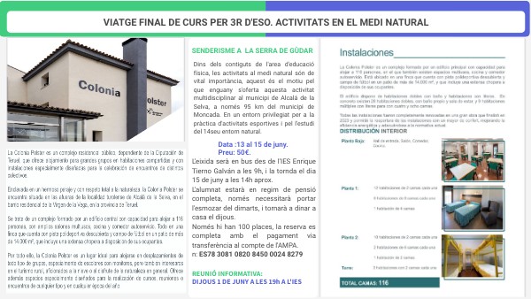 L'eixida serà en bus des de l'IES Enrique Tierno Galván a les 9h, i la tornda el dia 15 de juny a les 14h aprox. L'alumnat estarà en regim de pensió completa, només necessitarà portar l'esmozar del dimarts, i tornarà a dinar a casa el dijous. Només hi han 100 places, la reserva es completa amb el pagament via transferència al compte de l'AMPA. n: ES78 3081 0820 8450 0024 8279