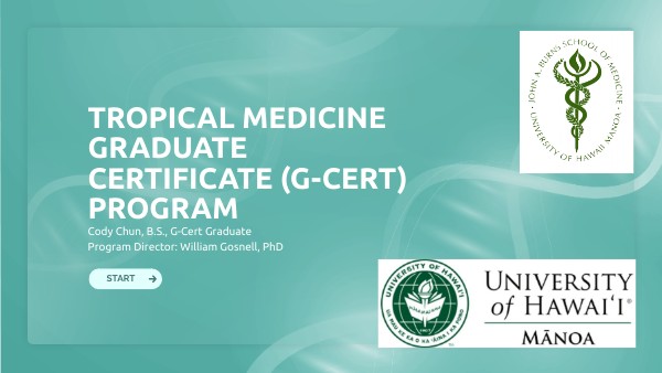 William Gosnell PhD, Graduate Certificate DirectorDepartment of Tropical Medicine, Medical Microbiology and Pharmacology John A. Burns School of Medicine Telephone: (808) 692-1623 Fax: (808) 692-1979 E-mail: gosnell@hawaii.edu Visit Website: https://manoa.hawaii.edu/tropicalmedicine/?page_id=2596