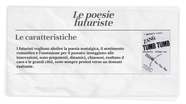 I futuristi vogliono abolire la poesia nostalgica, il sentimento romantico e l'ossessione per il passato; inneggiano alle innovazioni, sono prepotenti, dinamici, chiassosi, esaltano il caos e le grandi città, sono sempre protesi verso un domani esaltante.