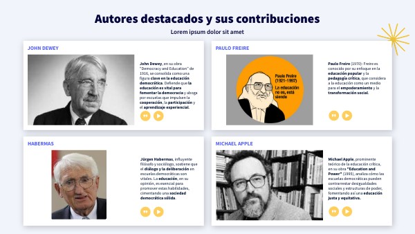 Paulo Freire (1970): Freire es conocido por su enfoque en la educación popular y la pedagogía crítica, que considera a la educación como un medio para el empoderamiento y la transformación social.