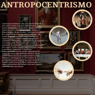 L'antropocentrismo è una concezione filosofica che pone l'uomo al centro edll'universo, come essere dominante e superiore rispetto ad altri essere viventi e alla natura stessa. Durante il Rinascimento, in particolare, l'antropocentrismo si è manifestato in modo molto evidente. Gli artisti di questo periodo hanno cercato di rappresentare l'uomo in modo sempre più realistico e dettagliato, utilizzando la prospettiva e la tecnica del chiaroscuro per creare la sesazione di profondità e tridimensionalità nelle loro opere. Inoltre hanno rappresentato l'uomo in posizioni dominanti e maestose. L'antropocentrismo ha anche influenzato la scelta dei temi rappresentati nell'arte. Molti artisti hanno deciso di rappresentare scene bibliche o mitologiche in cui l'uomo è il protagonista principale, e ha avuto un forte impatto sulla storia dell'arte, influenzando la rappresentazione dell'uomo e dei suoi rapporti con il mondo circostante.