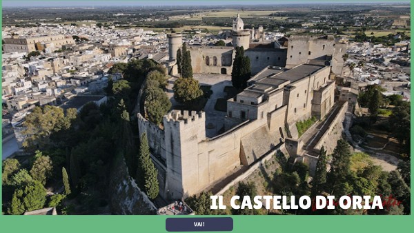 il castello di Oria fu realizzato tra il 1225 e il 1233 da l'imperatore Federico II.La definizione del castello è "gigantesco gioiello di pietra" e sintetizza lo splendore di questo maniero svevo posizionato su una collina nella parte più alta della città.