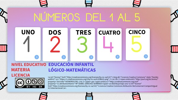 <a rel="license" href="http://creativecommons.org/licenses/by-nc-sa/4.0/"><img alt="Licencia Creative Commons" style="border-width:0" src="https://i.creativecommons.org/l/by-nc-sa/4.0/88x31.png" /></a><br /><span xmlns:dct="http://purl.org/dc/terms/" property="dct:title">NÚMEROS DEL 1 AL 5 </span> por <span xmlns:cc="http://creativecommons.org/ns#" property="cc:attributionName">Mª ISABEL SÁNCHEZ SERRANO</span> se distribuye bajo una <a rel="license" href="http://creativecommons.org/licenses/by-nc-sa/4.0/">Licencia Creative Commons Atribución-NoComercial-CompartirIgual 4.0 Internacional</a>.