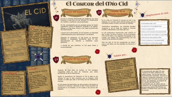 Temas principales El poema narra las hazañas y aventuras del héroe castellano Rodrigo Díaz de Vivar, conocido como El Cid. Expone los valores de la lealtad, el honor, la justicia y el amor filial. También destacan temas como la traición, el destierro y la búsqueda de redención.