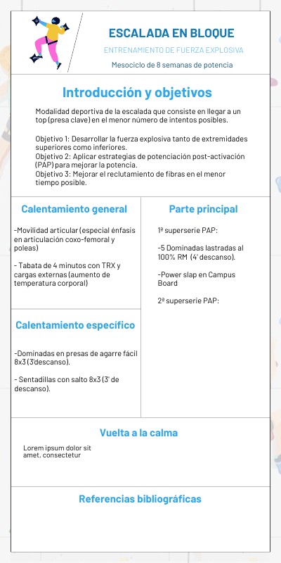 -Consuegra, S. (2020). Entrenamiento de escalada Basado En La evidencia Científica. Desnivel. -Sas-Nowosielski, K., & Kandzia, K. (2020). Post-activation Potentiation Response of Climbers Performing the Upper Body Power Exercise. Frontiers in Psychology, 11. https://doi.org/10.3389/fpsyg.2020.00467