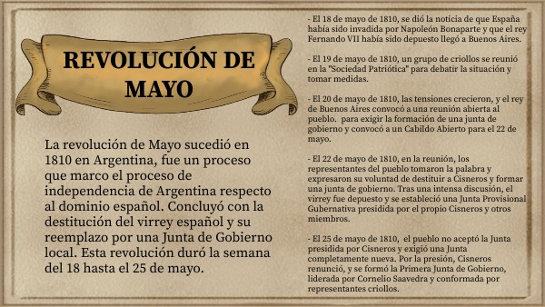 - El 18 de mayo de 1810, se dió la noticia de que España había sido invadida por Napoleón Bonaparte y que el rey Fernando VII había sido depuesto llegó a Buenos Aires. - El 19 de mayo de 1810, un grupo de criollos se reunió en la "Sociedad Patriótica" para debatir la situación y tomar medidas. - El 20 de mayo de 1810, las tensiones crecieron, y el rey de Buenos Aires convocó a una reunión abierta al pueblo. para exigir la formación de una junta de gobierno y convocó a un Cabildo Abierto para el 22 de mayo. - El 22 de mayo de 1810, en la reunión, los representantes del pueblo tomaron la palabra y expresaron su voluntad de destituir a Cisneros y formar una junta de gobierno. Tras una intensa discusión, el virrey fue depuesto y se estableció una Junta Provisional Gubernativa presidida por el propio Cisneros y otros miembros. - El 25 de mayo de 1810, el pueblo no aceptó la Junta presidida por Cisneros y exigió una Junta completamente nueva. Por la presión, Cisneros renunció, y se formó la Primera Junta de Gobierno, liderada por Cornelio Saavedra y conformada por representantes criollos.