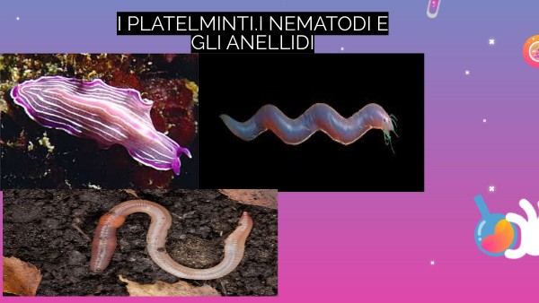 I platelminti,i nematodi e gli enellidi sono invertebrati che appartengono a tre diversi phyla ma hanno in comune il fatto di possedere un corpo vermiforme.il loro corpo può essere diviso da un piano di simmetria in due parti specularmente uguali:sono dotati cioè di simmetria bilaterale.tUTTI QUESTI ANIMALI HANNO INOLTRE UN'ESTREMITà ANTERIORE,IL CAPO,E UNA POSTERIORE,LA CODA.