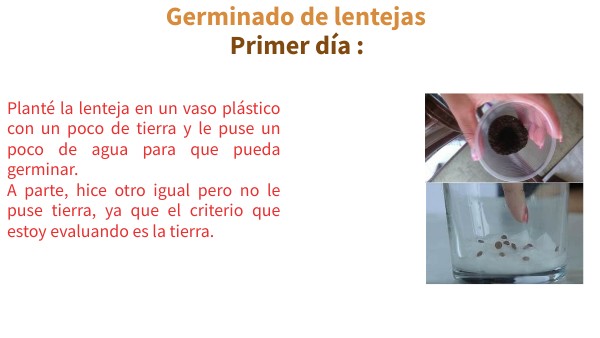 Planté la lenteja en un vaso plástico con un poco de tierra y le puse un poco de agua para que pueda germinar. A parte, hice otro igual pero no le puse tierra, ya que el criterio que estoy evaluando es la tierra.