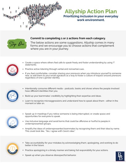 - Take time to follow through on your commitment. Each action you take brings you another step closer to fostering an inclusive environment and helps you better understand the experience of your underrepresented teammates.