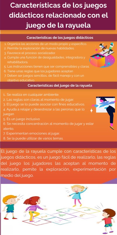 El juego de la rayuela cumple con características de los juegos didácticos, es un juego fácil de realizarlo, las reglas del juego los jugadores las aceptan al momento de realizarlo, pemite la exploración, experimentación por medio del juego.