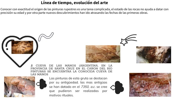 1. Pintura rupestre neandertal,Creación hace aproximadamente 73 mil años. Las primeras pinturas en su mayoria son de animales salvajes, en algunas también hay de seres humanos.