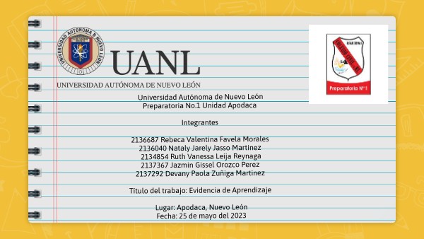 Universidad Autónoma de Nuevo LeónPreparatoria No.1 Unidad Apodaca Integrantes 2136687 Rebeca Valentina Favela Morales 2136040 Nataly Jarely Jasso Martinez 2134854 Ruth Vanessa Leija Reynaga 2137367 Jazmin Gissel Orozco Perez 2137292 Devany Paola Zuñiga Martinez Título del trabajo: Evidencia de Aprendizaje Lugar: Apodaca, Nuevo León Fecha: 25 de mayo del 2023