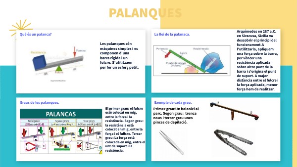 Les palanques són màquines simples i es componen d'una barra rígida i un fulcre. S'utilitzaen per fer un esforç petit.