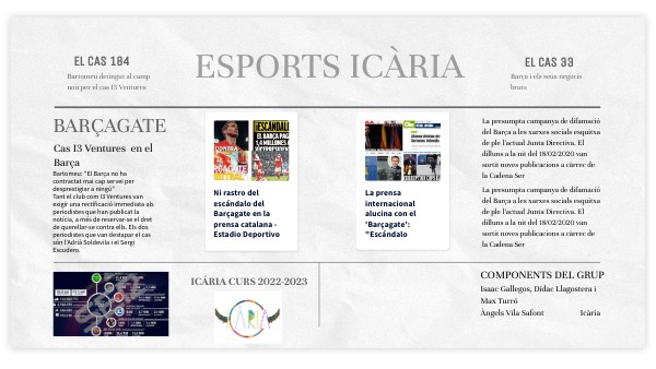 Hola, som en Max Turró, l’Isaac Gallegos i en Dídac Llagostera, en aquest treball us presentarem el nostre treball de recerca sobre el Barçagate.Hem volgut buscar informació sobre el cas I3 Ventures, també dit Barçagate, i després fer un estudi comparatiu per veure la premsa que es posiciona a favor de Bartomeu i la premsa que no.