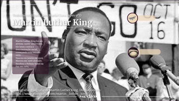 Martin Luther King foi um ativista norte-americano. Ele lutou contra a descriminação racial, começando esta luta em 1955. Nasceu em janeiro de 1929. Morreu em 1968 alvejado. Recebeu o Prémio Nobel da Paz em 1964.