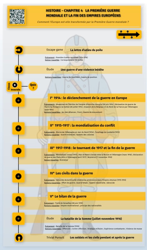 Évènements : Assassinat de l'héritier de l’empire d’Autriche-Hongrie (28 juin 1914) ; Déclaration de guerre de l'Autriche-Hongrie à la Serbie (28 juillet 1914) ; Invasion de la Belgique et du Nord de la France par l'Allemagne (août 1914) Notions travaillées : Jeu des alliances ; Front ; Guerre de mouvement