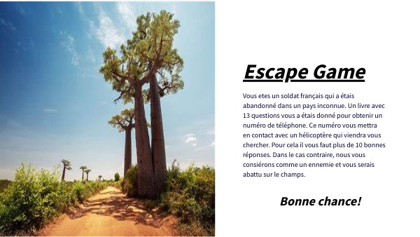 Vous etes un soldat français qui a étais abandonné dans un pays inconnue. Un livre avec 13 questions vous a étais donné pour obtenir un numéro de téléphone. Ce numéro vous mettra en contact avec un hélicoptère qui viendra vous chercher. Pour cela il vous faut plus de 10 bonnes réponses. Dans le cas contraire, nous vous consiérons comme un ennemie et vous serais abattu sur le champs.