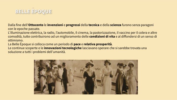 Dalla fine dell’Ottocento le invenzioni e progressi della tecnica e della scienza furono senza paragoni con le epoche passate. L’illuminazione elettrica, la radio, l’automobile, il cinema, la pastorizzazione, il vaccino per il colera e altre comodità, tutte contribuirono ad un miglioramento delle condizioni di vita e al diffondersi di un senso di ottimismo. La Belle Époque si colloca come un periodo di pace e relativa prosperità. Le continue scoperte e le innovazioni tecnologiche lasciavano sperare che si sarebbe trovata una soluzione a tutti i problemi dell’umanità.