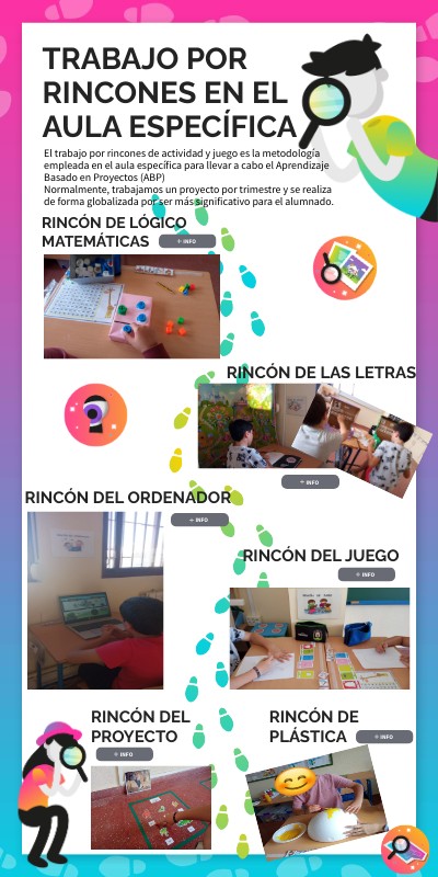 El trabajo por rincones de actividad y juego es la metodología empleada en el aula específica para llevar a cabo el Aprendizaje Basado en Proyectos (ABP) Normalmente, trabajamos un proyecto por trimestre y se realiza de forma globalizada por ser más significativo para el alumnado.
