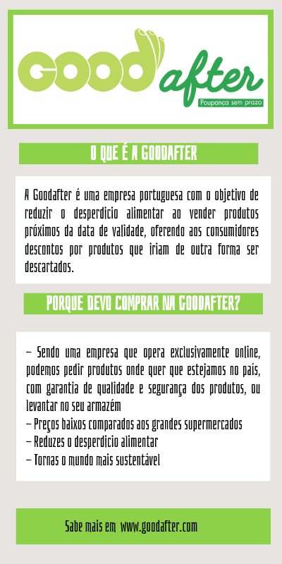 A Goodafter é uma empresa portuguesa com o objetivo de reduzir o desperdicio alimentar ao vender produtos próximos da data de validade, oferendo aos consumidores descontos por produtos que iriam de outra forma ser descartados.
