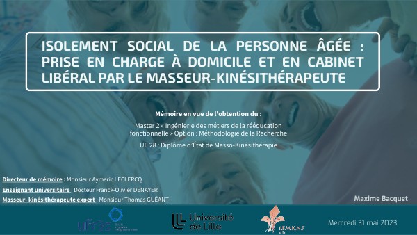 9. Gangbè M, Ducharme F. Le « bien vieillir » : concepts et modèles. Med Sci. 2006 Mar ;22(3) :297-300.Boita F, Couderc LJ, Crestani B, et al.10. Évaluation de la fonction respiratoire chez le sujet âgé. Rev Mal Respir 2006; 23: 619–28. 11. Conseil national des ainés. Revue exploratoire de la littérature : l’isolement social des ainés, 2013-2014 [en ligne]. Ottawa : Gouvernement du Canada; 2014 [cité le 21 mai 2022]. Disponible: https://central.bac-lac.gc.ca/.item?id=Em12-7-2014-fra&op=pdf&app=Library. 12. Page d'accueil Allocataires | [En ligne]. 4 idées pour lutter contre l’isolement des personnes âgées | Bienvenue sur Caf.fr ; [cité le 28 septembre 2022]. Disponible : https://www.caf.fr/allocataires/vies-de-famille/articles/4-idees-pour-lutter-contre-l-isolement-des-personnes-agees . 13. Observatoire National de la Pauvreté et de l'Exclusion Sociale [En ligne]. [cité le 28 sep 2022]. Disponible : https://onpes.gouv.fr/IMG/pdf/2017-09-13_-_les_trois_formes_de_solitude_dgcs-massp_.pdf . 14. Van Rompaey C. Solitude et vieillissement. Pensée plurielle [En ligne]. 2003 [cité le 15 déc 2022];6(2):31. Disponible : https://doi.org/10.3917/pp.006.0031 . 15. Freedman A, Nicolle J. Isolement social et solitude : les nouveaux géants gériatriques : approche à l’intention des soins primaires. Can Fam Physician. 2020 ;66(3) :78-85. 16. Etude prospective des métiers sensibles de la fonction publique hospitalière. Monographie Masseur-kinésithérapeute. Ministère de la santé et des sports; 2008 oct. 17. Loi n°46-857 du 30 avril 1946 tendant à réglementer l’exercice des profes- sions de masseur gymnaste médical et de pédicure J.O. [En ligne]. 46-857 avr 30, 1946. [cité le 28 sep 2022]. Disponible sur: https://www.legifrance.gouv.fr/jorf/article_jo/JORFARTI000002069311 .