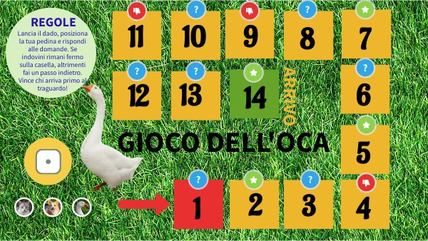 Lancia il dado, posiziona la tua pedina e rispondi alle domande. Se indovini rimani fermo sulla casella, altrimenti fai un passo indietro. Vince chi arriva primo al traguardo!