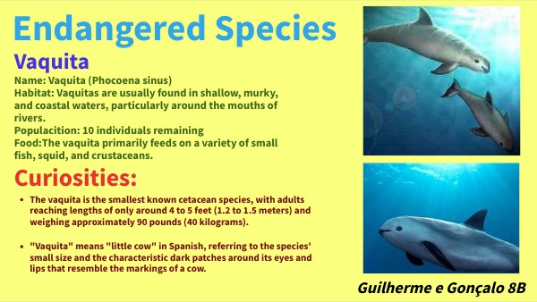 Name: Vaquita (Phocoena sinus) Habitat: Vaquitas are usually found in shallow, murky, and coastal waters, particularly around the mouths of rivers. Populacition: 10 individuals remaining Food:The vaquita primarily feeds on a variety of small fish, squid, and crustaceans.