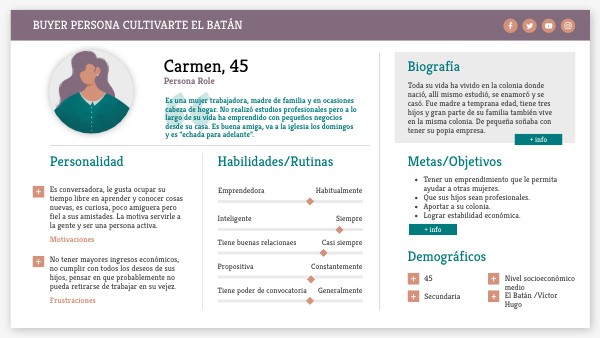 Es una mujer trabajadora, madre de familia y en ocasiones cabeza de hogar. No realizó estudios profesionales pero a lo largo de su vida ha emprendido con pequeños negocios desde su casa. Es buena amiga, va a la iglesia los domingos y es "echada para adelante".