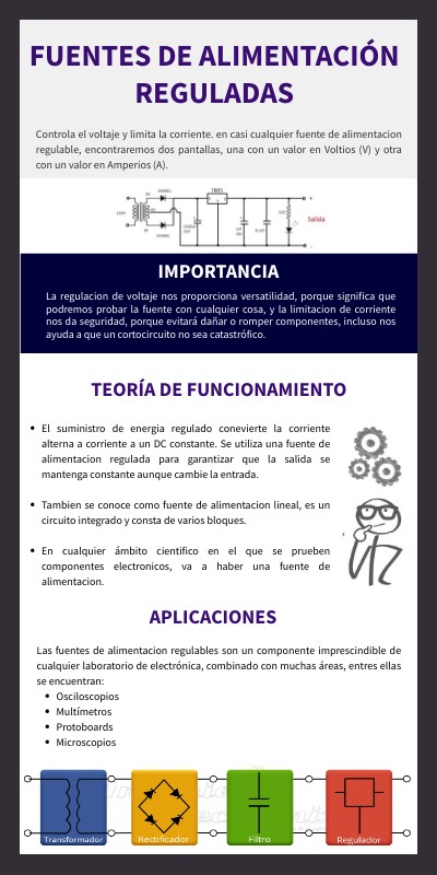- El suministro de energia regulado conevierte la corriente alterna a corriente a un DC constante. Se utiliza una fuente de alimentacion regulada para garantizar que la salida se mantenga constante aunque cambie la entrada.