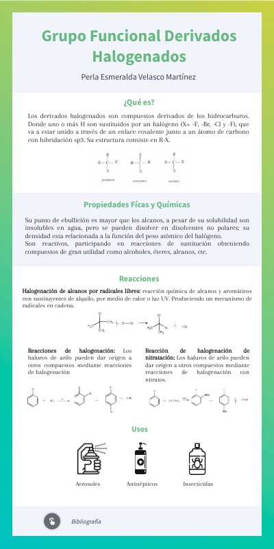 Los derivados halogenados son compuestos derivados de los hidrocarburos. Donde uno o más H son sustituidos por un halógeno (X= -F, -Br, -Cl y -F), que va a estar unido a través de un enlace covalente junto a un átomo de carbono con hibridación sp3. Su estructura consiste en R-X.