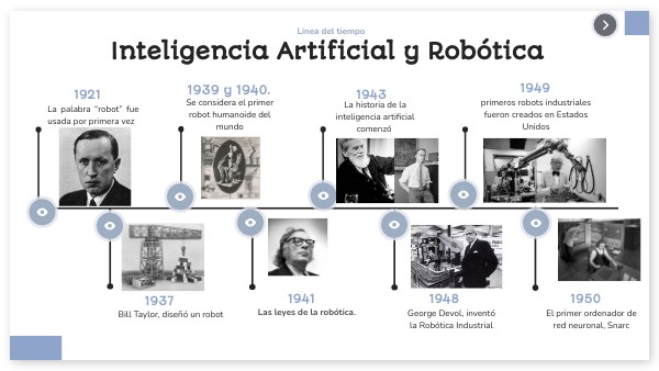 https://www.ferrovial.com/es/innovacion/tecnologias/robotica/#:~:text=Seg%C3%BAn%20algunas%20fuentes%2C%20los%20primeros,fue%20construido%20por%20la%20Westinghouse. https://robotnik.eu/es/historia-de-los-robots-y-la-robotica/ https://datascientest.com/es/inteligencia-artificial-definicion#:~:text=La%20historia%20de%20la%20inteligencia%20artificial%20comenz%C3%B3%20en%201943%20con,creaci%C3%B3n%20de%20una%20red%20neuronal. https://www.nationalgeographic.com.es/ciencia/breve-historia-visual-inteligencia-artificial_14419