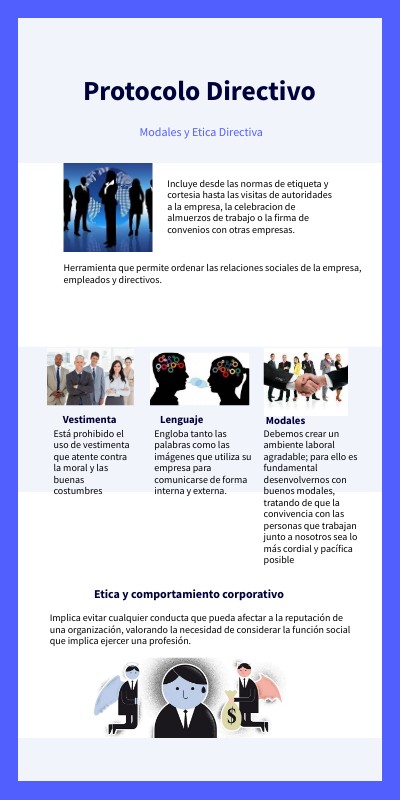 Incluye desde las normas de etiqueta y cortesia hasta las visitas de autoridades a la empresa, la celebracion de almuerzos de trabajo o la firma de convenios con otras empresas.