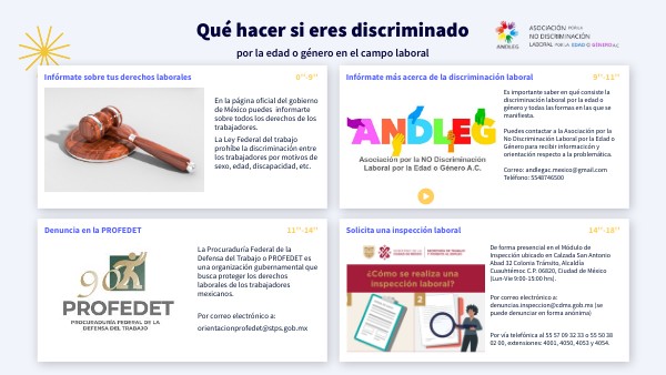 Es importante saber en qué consiste la discriminación laboral por la edad o género y todas las formas en las que se manifiesta. Puedes contactar a la Asociación por la No Discriminación Laboral por la Edad o Género para recibir informacicón y orientación respecto a la problemática.Correo: andlegac.mexico@gmail.com Teléfono: 5548746500