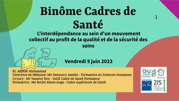EL ABJANI Abdssamad Directrice de Mémoire: Me Demoncy Amélie - Formatrice en Sciences Humaines Co-jury : Mr Vasseur Eric - IADE Cadre de Santé Formateur Formatrice : Me Boclet Marie-Ange : Cadre supérieure de Santé