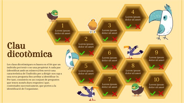 Les claus dicotòmiques es basen en el fet que un individu pot tenir o no una propietat A cada pas (identificat amb un número) fem servir una característica de l’individu per a dirigir-nos cap a una nova pregunta fins arribar a identificar-lo. Per tant, consisteix en un conjunt de preguntes que tenen només dues respostes i que, contestades successivament, que porten a la identificació de l’organisme.
