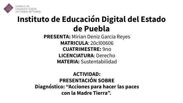 PRESENTA: Mirian Deniz Garcia ReyesMATRICULA: 20cl00606CUATRIMESTRE: 9no LICENCIATURA: Derecho MATERIA: Sustentabilidad ACTIVIDAD: PRESENTACIÓN SOBRE Diagnóstico: “Acciones para hacer las paces con la Madre Tierra”.