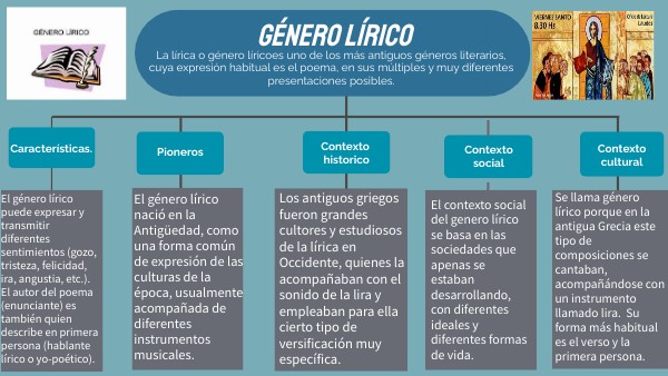 Se llama género lírico porque en la antigua Grecia este tipo de composiciones se cantaban, acompañándose con un instrumento llamado lira. Su forma más habitual es el verso y la primera persona.