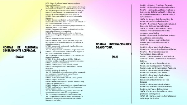 NAGA 1 – Objeto y Principios Generales NAGA 2 – Normas Personales del Auditor NAGA 3 –Normas de Auditoría relativas a la ejecución de la tarea NAGA 4 – Normas de Auditoría Relativas a la Información y su Valoración NAGA 5 – Normas de Información y de actuación profesional del auditor NAGA 6 – Normas de Auditoría Relativas al Concepto de Importancia Relativa NAGA 7 – Normas de Auditoría sobre Trabajos Previamente examinados, revisados o auditados NAGA 8 – Normas de Auditoría en Materia de Auditorías Concertadas NAGA 9 – Normas sobre el Control Interno y su Evaluación durante la auditoría NAGA 10 – Normas de Auditoría en Materia de Cuentas Anuales Consolidadas NAGA 11 – Normas relativas a las Auditorías de Cooperativas NAGA 12 – Normas sobre la Auditoría de Cuentas Anuales Consolidadas del Sector Público NAGA 13 – Normas de Auditoría en Materia de Investigación y Asistencia Recíproca de los Organismos de Auditoría NAGA 14 – Normas de Auditoría en Materia de Auditoría de Calidad NAGA 15 – Normas de Auditoría en Materia de Auditoría de las Establecimientos Financieros y de Seguros NAGA 16 – Normas de Auditoría en Materia de Auditoría de las Entidades Gestoras de Planes de Pensiones NAGA 17 – Normas de auditoria sobre planes de contingencia NAGA 18 – Normas sobre la formalización del trabajo del Auditor