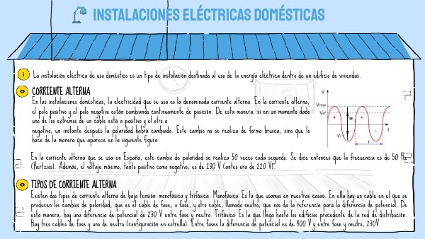 En las instalaciones domésticas, la electricidad que se usa es la denominada corriente alterna. En la corriente alterna, el polo positivo y el polo negativo están cambiando continuamente de posición. De esta manera, si en un momento dado uno de los extremos de un cable está a positivo y el otro a negativo, un instante después la polaridad habrá cambiado. Este cambio no se realiza de forma brusca, sino que lo hace de la manera que aparece en la siguiente figura: