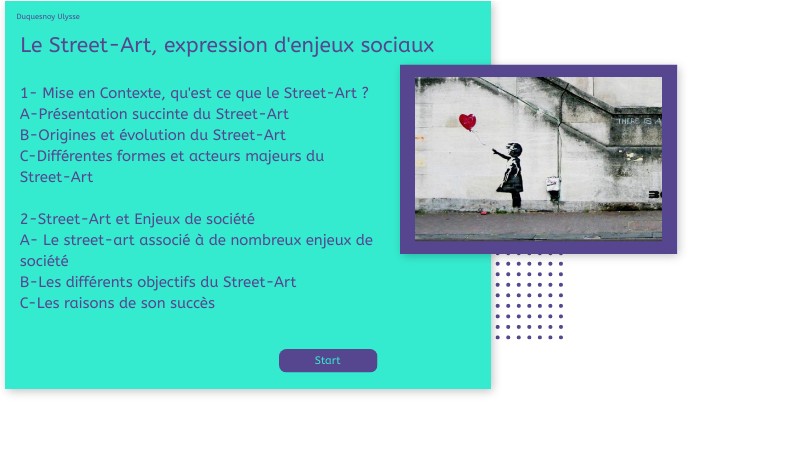 1- Mise en Contexte, qu'est ce que le Street-Art ?A-Présentation succinte du Street-Art B-Origines et évolution du Street-Art C-Différentes formes et acteurs majeurs du Street-Art 2-Street Art et Enjeux de Société A- Le street-art associé à de nombreux enjeux de société B-Les différents objectifs du Street-Art C-Les raisons de son succès
